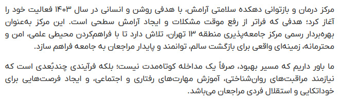 ما باور داریم که مسیر بهبود، صرفاً یک مداخله کوتاهمدت نیست؛ بلکه فرآیندی چندبُعدی است که نیازمند مراقبتهای روانشناختی، آموزش مهارتهای رفتاری و اجتماعی، و ایجاد فرصتهایی برای خوداتکایی و استقلال فردی مراجعان میباشد.